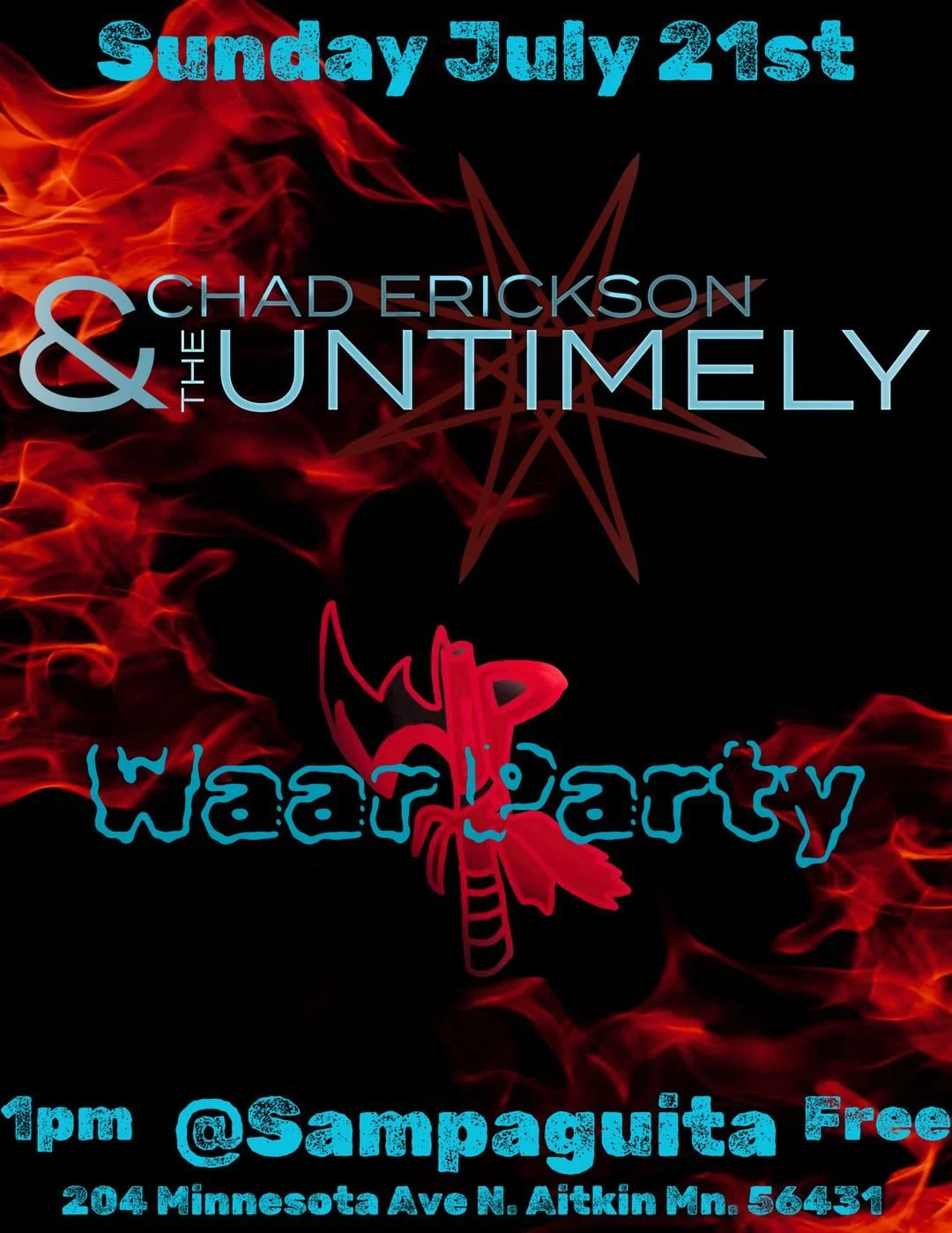 Back to All Events Chad Erickson & The Untimely Waar Party Sunday, July 21, 2024 1:00 PM 3:00 PM Sampaguita 204 Minnesota Avenue North Aitkin, MN, 56431 United States (map) Google Calendar ICS